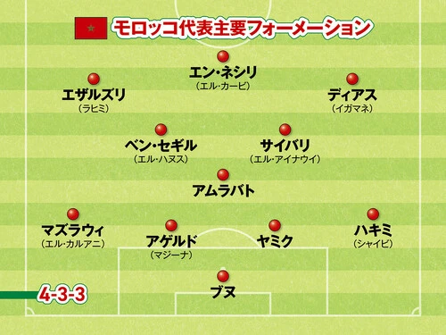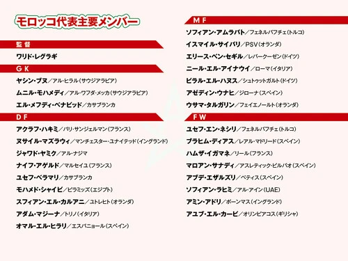 前回の躍進の立役者であるヤシン・ブヌ(アル・ヒラル)、アクラフ・ハキミ(パリ・サンジェルマン)、ソフィアン・アムラバト(フェネルバフチェ)、ユセフ・エン・ネシリ(フェネルバフチェ)らは今大会も健在で、チームの中心となる。