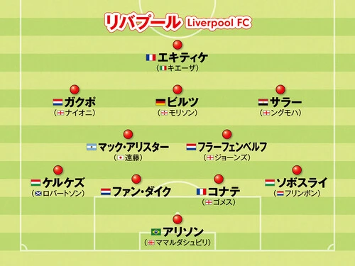 MF:フロリアン・ビルツ(キーラン・モリソン)、アレクシス・マック・アリスター(遠藤航)、ライアン・フラーフェンベルフ(カーティス・ジョーンズ)