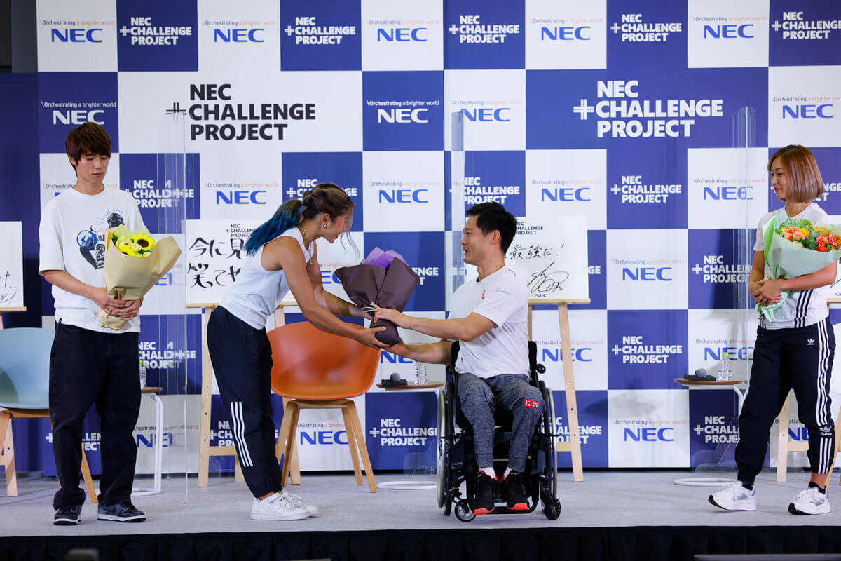 国枝は「僕も日ごろから『挑戦』を掲げて活動している。そこにマッチするプロジェクトなので、楽しみ」と笑顔を見せ、中西は「日ごろから、『地方から世界へ』という目標で活動しているが、地方では情報量や環境設備の少なさなど壁にあたってきた。NECさんに力を必要とする人たちの背中を押してもらえるのは弾みになるし、私も、この力を待っていました。一緒に活動できることをうれしく思う」とコメントした。