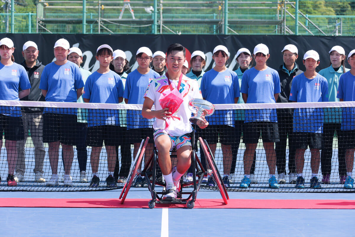 表彰式で前回王者の国枝慎吾氏から天皇杯を授かると、小田はまぶしい笑顔を見せ天皇杯を高らかに掲げた。