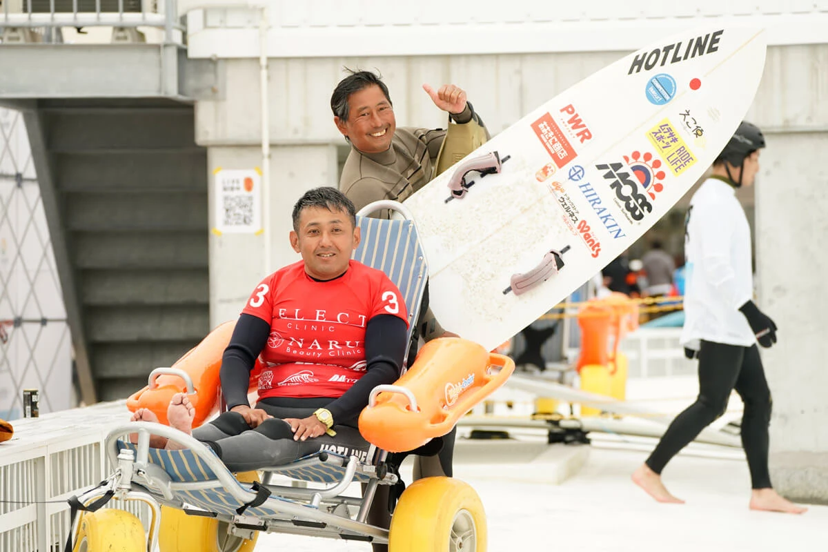 また、パラサーフィンは水中での競技であり、移動補助や安全性確保のため多くのサポーターやボランティアが競技を支えており、選手とのチームワークやコラボレーションの様子も魅力といえる。今大会でも、水陸両用車いすを利用した水中までの移動サポートや波に合わせてボードを押す人(ピッチャー)、ライディング後にボードを受け止める人(キャッチャー)など多くの人が関わり、選手とともに大会を作り上げていた姿が印象的だった。