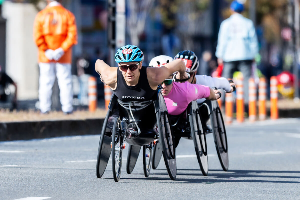 11月19日、「第42回大分国際車いすマラソン」が行われ、日本のほか、アメリカやスイス、オーストラリア、韓国など14カ国・地域から参加した選手たちが晴天の大分市内を疾走した。最も注目を浴びたマラソン男子(T34/53/54)では、銀色のヘルメットを着用することから“銀色の弾丸”の異名を持つマルセル・フグ(スイス)が自身が持つ世界記録に迫る好タイムで5大会連続11回目の優勝に輝いた。またマラソン女子(T34/53/54)はハイペースのレースとなり、2秒差で3選手がゴールする接戦を繰り広げた。
