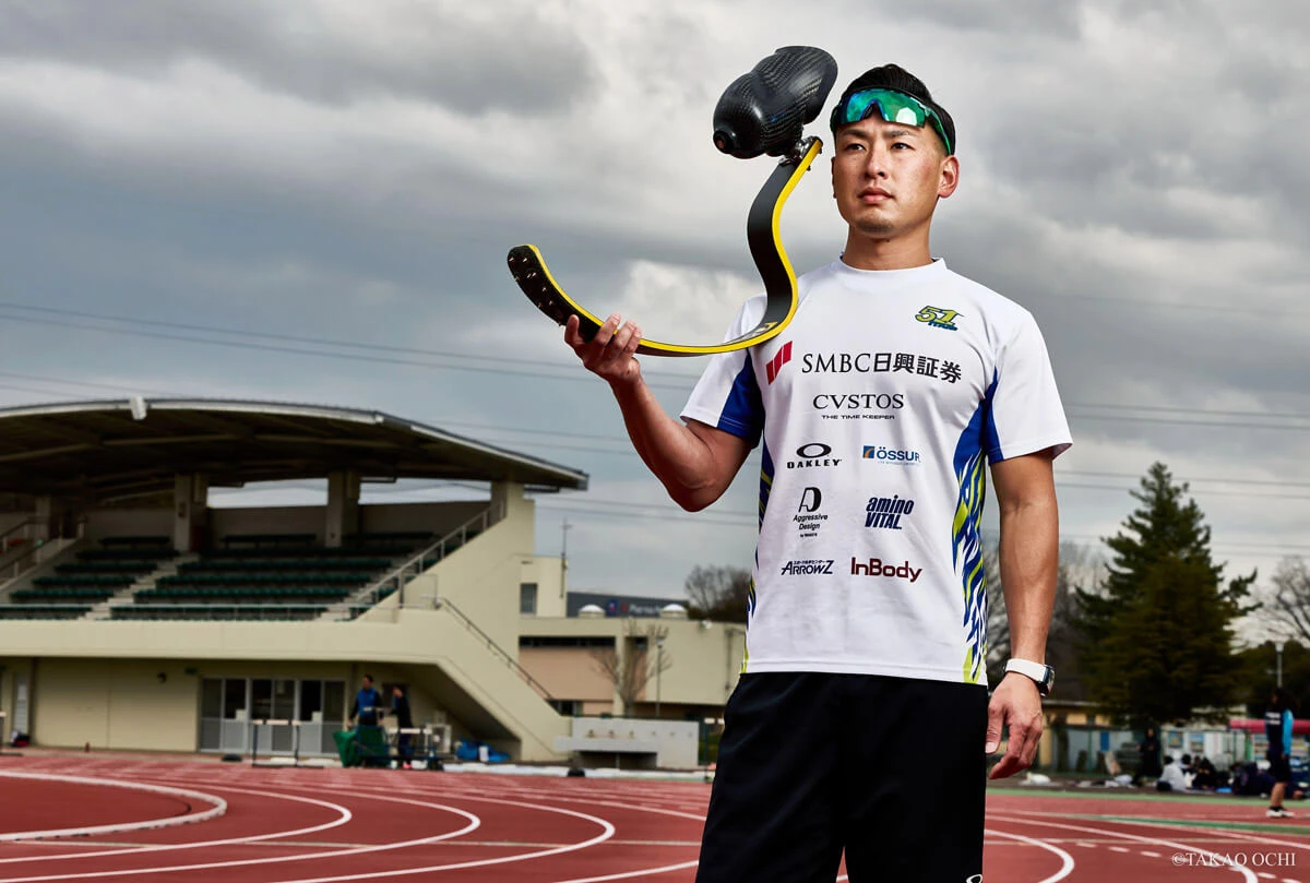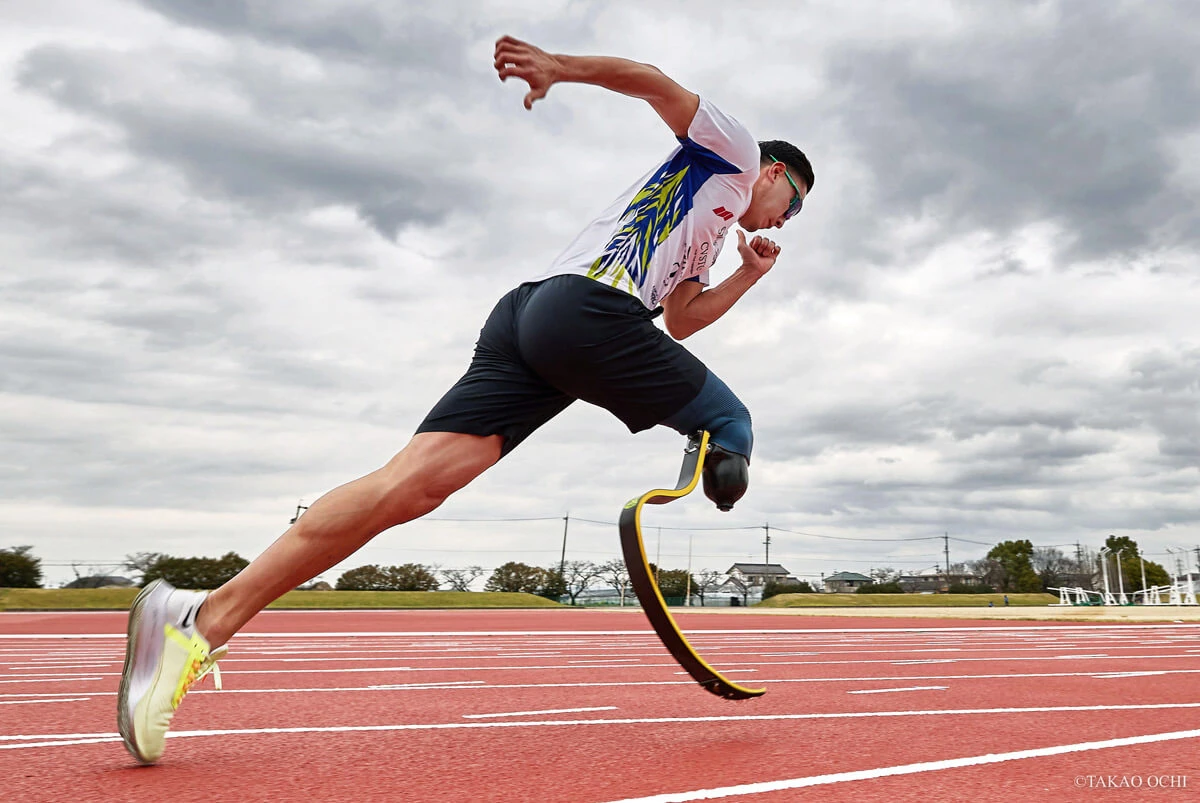 スタート直後、左足が地面を蹴ると、引き締まった筋肉から血管が浮き出る。右のカーボン製の義足が瞬時に前へ出る。左右の脚が異なる音で地面を叩く。そのテンポが一瞬で加速し、日焼けした体は弾丸のように風を切っていく。昨年のアジアパラ大会200mで、アジア人初の22秒台を記録した義足のスプリンター井谷俊介だ。