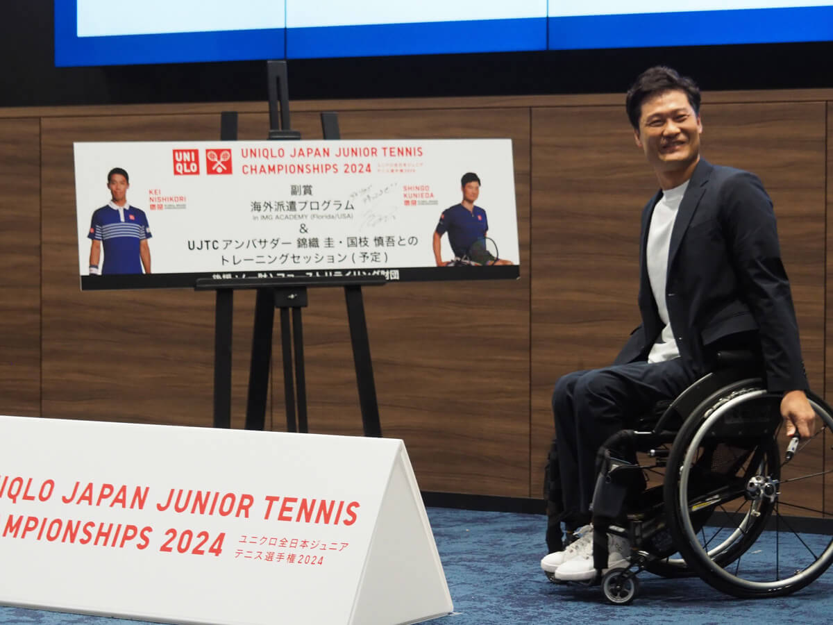 国枝氏は大会アンバサダーとして、「こうした垣根を越えた活動はおそらくテニスがどのスポーツよりも先を行っていると認識している。グランドスラムでの同時開催が車いすテニスの今日の発展につながっていると思うし、全日本ジュニアの中に(車いす部門が)組み込まれることで、車いすテニスにとっても歴史ある大会になることを願っている」と取り組みの意義を強調。さらに、「ジュニアの選手にとって、この大会が最大目標になるよう、僕自身もサポートしていきたい」と意気込みを語った。
