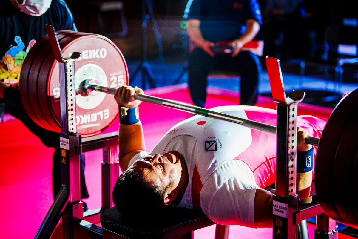 選手が使用するのはパラ専用のベンチプレス台で、脚は地面に着けずに台上に全身を乗せて腕の力のみでバーベルを挙上する。