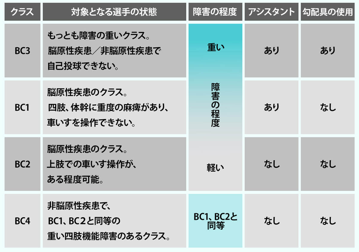 クラスは障害の程度によりBC1~4の4つのクラスに分けられる。BC1~2は個人戦と3対3のチーム戦、BC3~4では個人戦、ペア戦が行われる。東京2020パラリンピックまではいずれも男女混合だったが、パリ2024パラリンピックでは個人戦は男女別で行われる。クラスや種目ごとに投球の制限時間が決められており、時間内にすべてを投げ終えられなかった場合は、残りの球を投げることはできない。