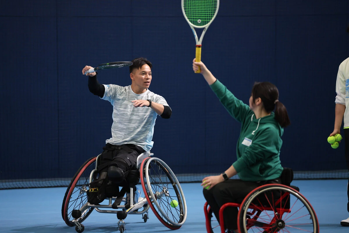 クリニックは競技レベルに応じて3つのクラスに分けて行われた。初級者から上級者のクラスでは、車いすテニスとフィットネスを組み合わせた本格的なレッスンを実施。プロ選手とのヒッティングも行い、参加者たちは真剣な眼差しでラケットを握っていた。休憩中や待機時間には参加者から講師に声をかけてレクチャーを受ける場面もあり、積極的に行動する様子が印象的だった。