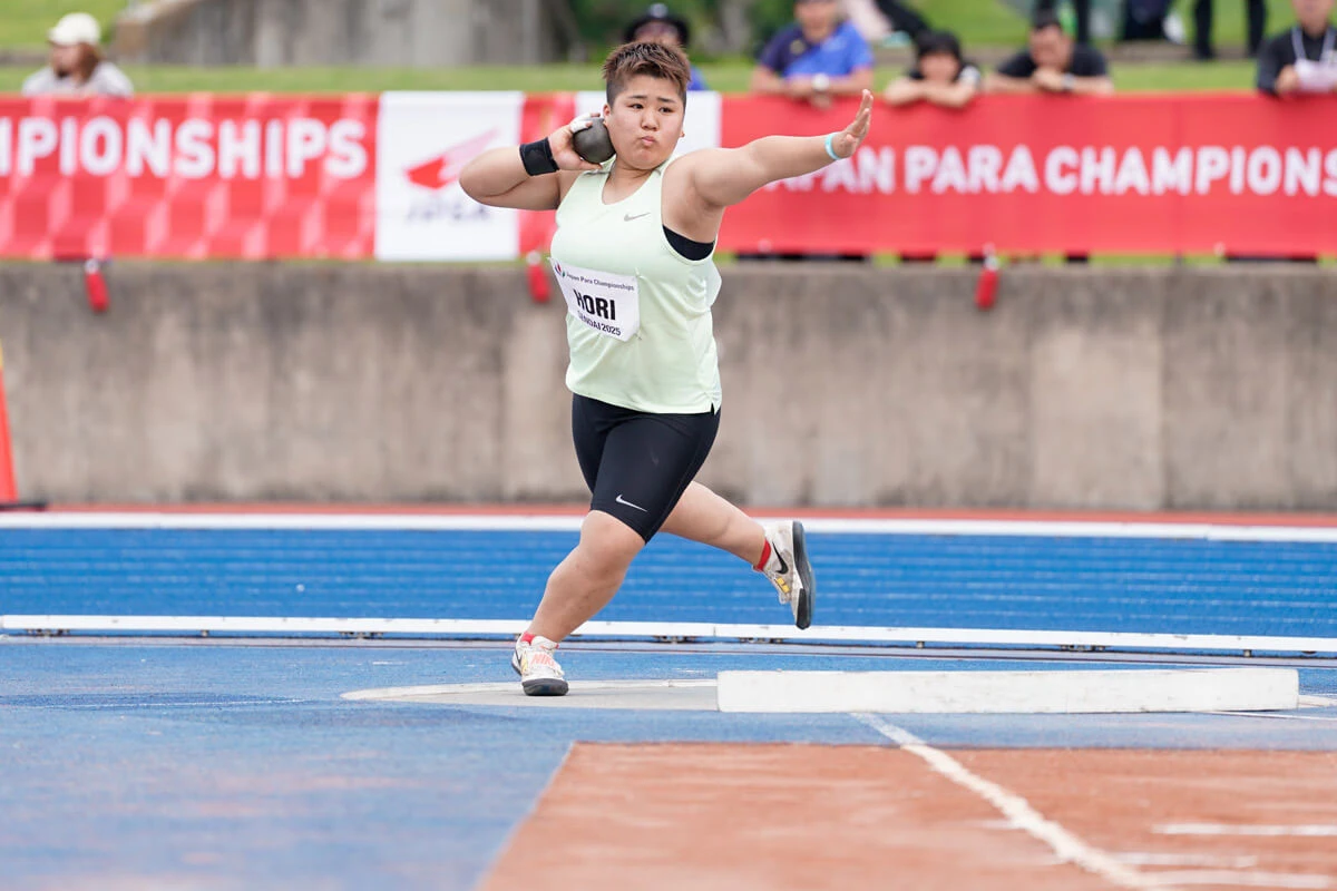 堀玲那(WORLD-AC)は女子砲丸投げF20(知的障害)で世界選手権代表に初選出された。今大会では11m74の大会新に留まったが、4月末の大会で12m81のアジア新記録を樹立するなど好調だ。また、前日のやり投げでは自身のもつ日本記録を33㎝伸ばす42m17をマークした(6月末、45m96に更新)。メイン種目はパラリンピックや世界選手権で実施のある砲丸投げだが、やり投げにも「リリースポイントが一緒だと感じているし、しっかりと全身で投げるところが関連してると思う」と相乗効果を口にする。