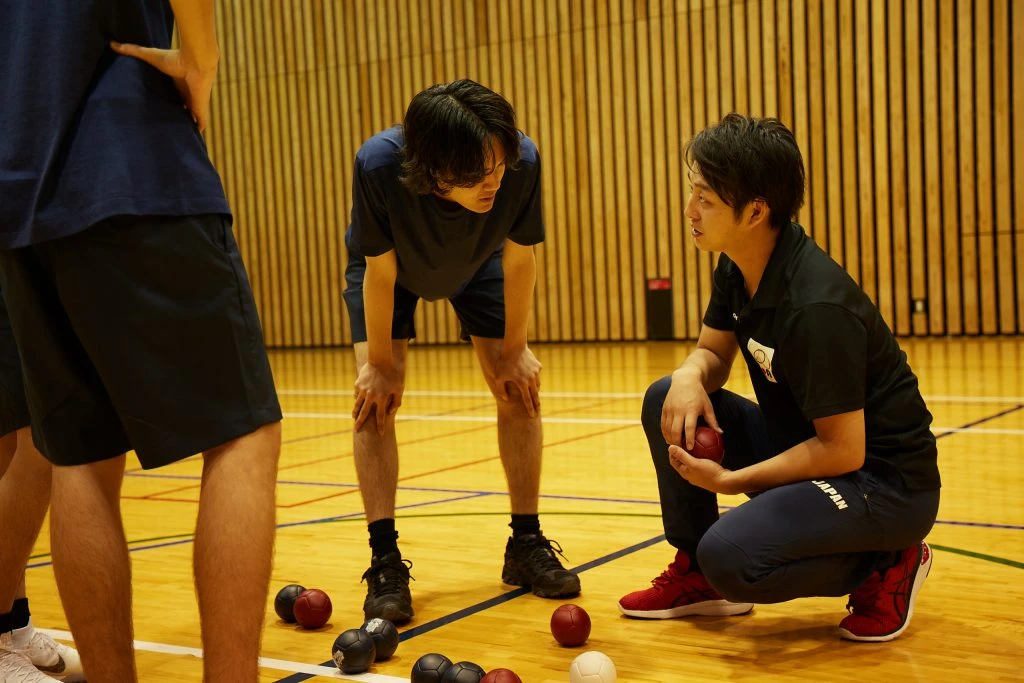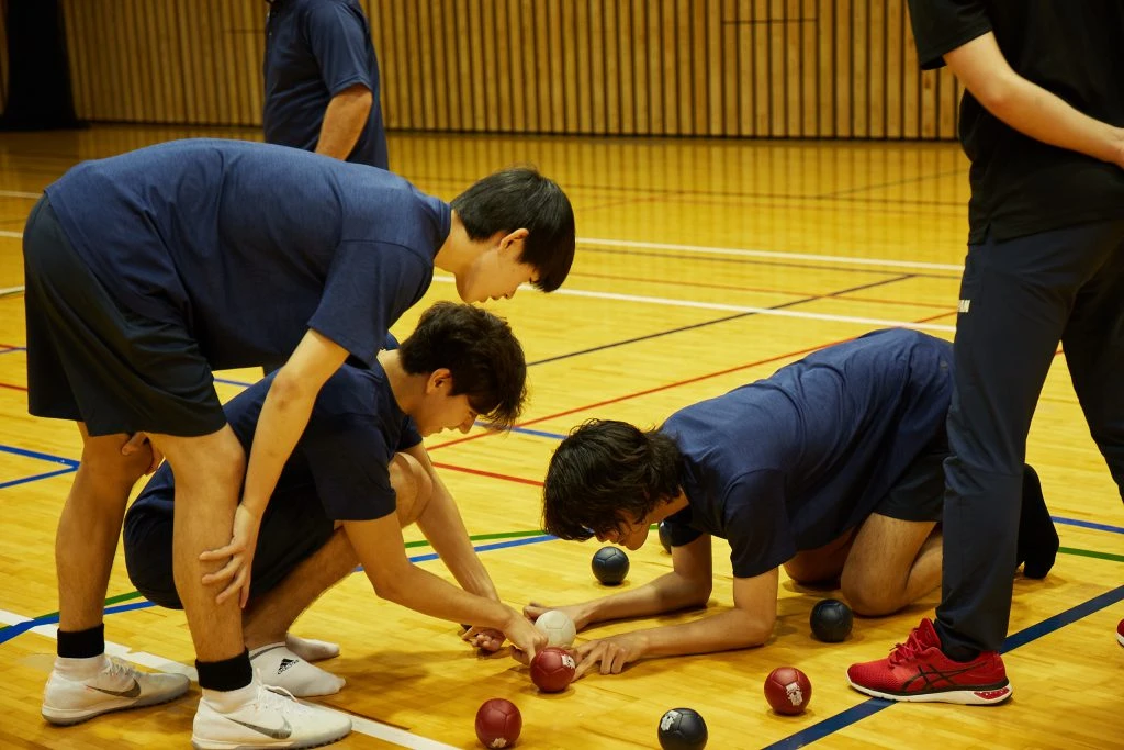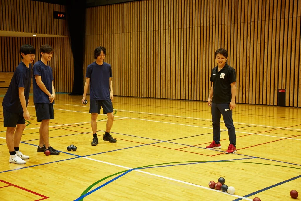 今回ボッチャ部を指導してくれたのは、2016年のリオデジャネイロパラリンピックで日本代表選手のアシスタントも担当した日本ボッチャ協会の新井大基さん。基礎からシチュエーションごとの駆け引きまで様々なテクニックを伝授してくれた。遠藤、坂田、ミッチェルはメンズノンノモデルの中でもとくにスポーツ経験が豊富な3人だけに、飲み込みが早く、練習を重ねるごとに随所にポテンシャルの高さを見せてくれた!