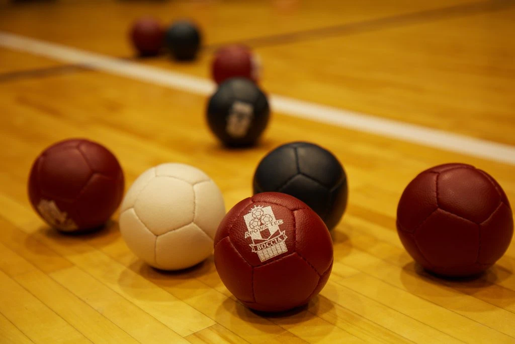 次に、ルールだ。上の写真がボッチャボールで、素材は革やフェルトなど少し重みのある素材が使われている。チームごとに赤と青に分かれ、「ジャックボール」と呼ばれる白の目標球にそれぞれどれだけ近づけるかを競うスポーツだ。1エンドごとに、このジャックボールに最も近づいた側にのみ得点が入るシステムとなっている。