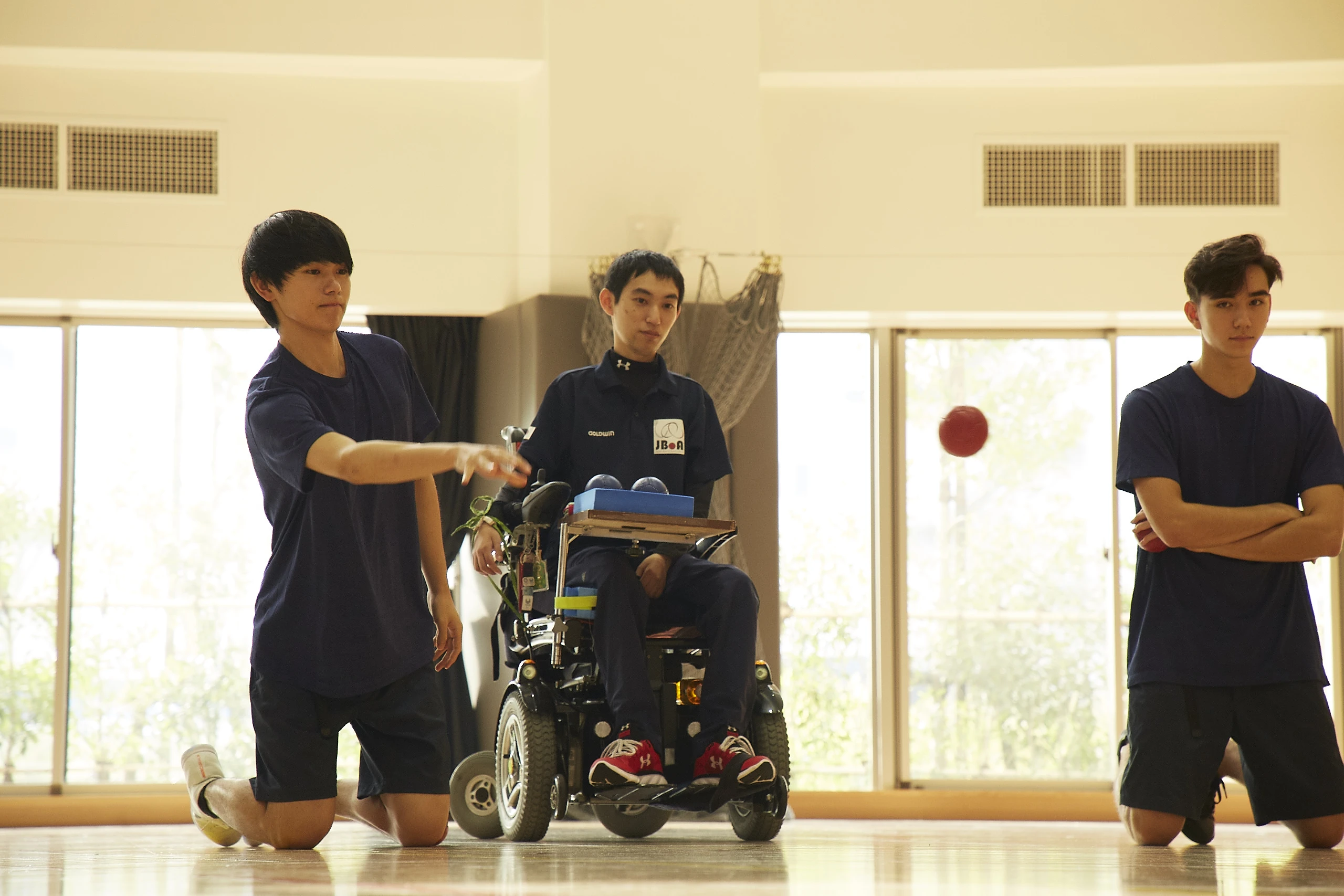 そしてなんと、練習終了後には特別に選手たちから直接指導を受けられるという絶好の機会に恵まれた3人。一緒にプレーをしながらレクチャーしてくれたのは、昨年のボッチャ日本選手権でBC4を制した古満渉選手と「火の玉ジャパン」期待の17歳、江崎駿選手。短い時間ながら、まっすぐブレずに投げるコツなどを、3人の横にぴったりと寄り添いながら丁寧に教えてくれた。「まずは大会に出ること」を目標に掲げるボッチャ部にとってはこれ以上ないレベルアップの機会となった。