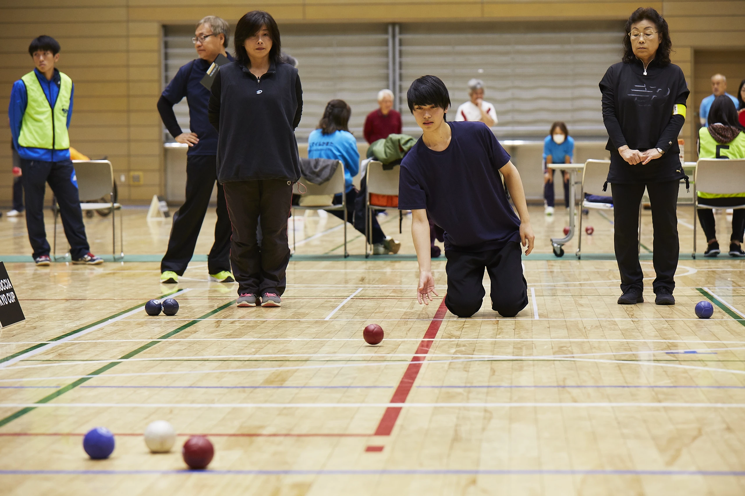 脳性まひなどの重い障がいのある人のためにヨーロッパで考案されたパラスポーツで、赤と青のボールを6球ずつ投げて白い的球(まとだま)にどれだけ近づけられるかを競う。障がいの度合いによってBC1からBC4まで4つのカテゴリーに分けられており、自力で投球ができない選手たちのためのBC3ではアシスタントによるサポートのもとランプという勾配器具が使用される。現在、日本には車いすの使用有無を問わない独自の「オープンクラス」があり、障がいのない人でも大会に出場できることで人気を高めている。