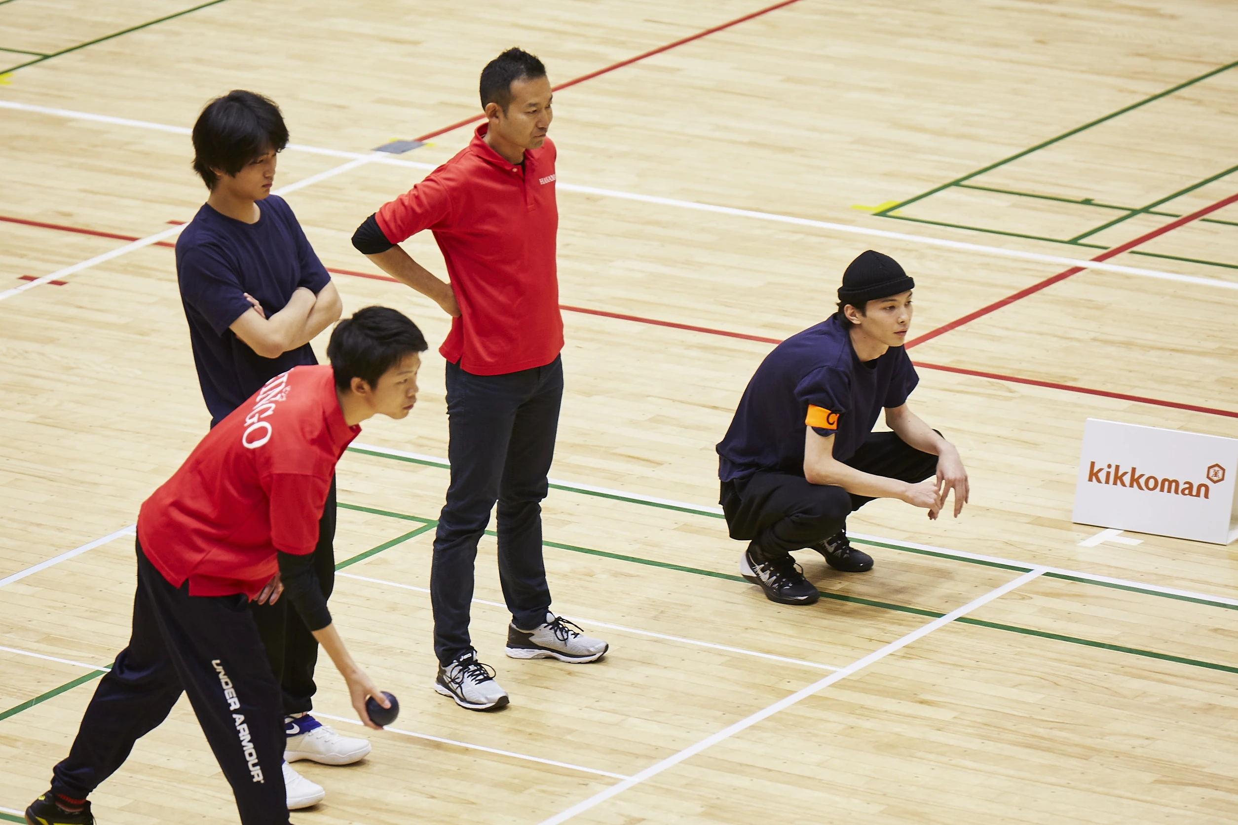 初戦の対戦相手はチーム「sugar」。年配の方々中心の一般参加チームだったが、それだけに経験が豊富で、メンズノンノ・ボッチャ部は試合開始からなかなか思うようなアプローチをさせてもらえない。結果、2エンドともに0-1で落とし、合計0-2で敗れた。「練習でうまくいっていたことがなかなか出せなかったです。ジャックボールをあえて遠くに置く作戦なども練習では手応えを感じていたのですが、相手チームにブロックをうまく作られて逆に自分たちに不利になってしまいました。やはり相手がいると違いましたね」とは、今大会でキャプテンマークを巻いた守屋のコメント。