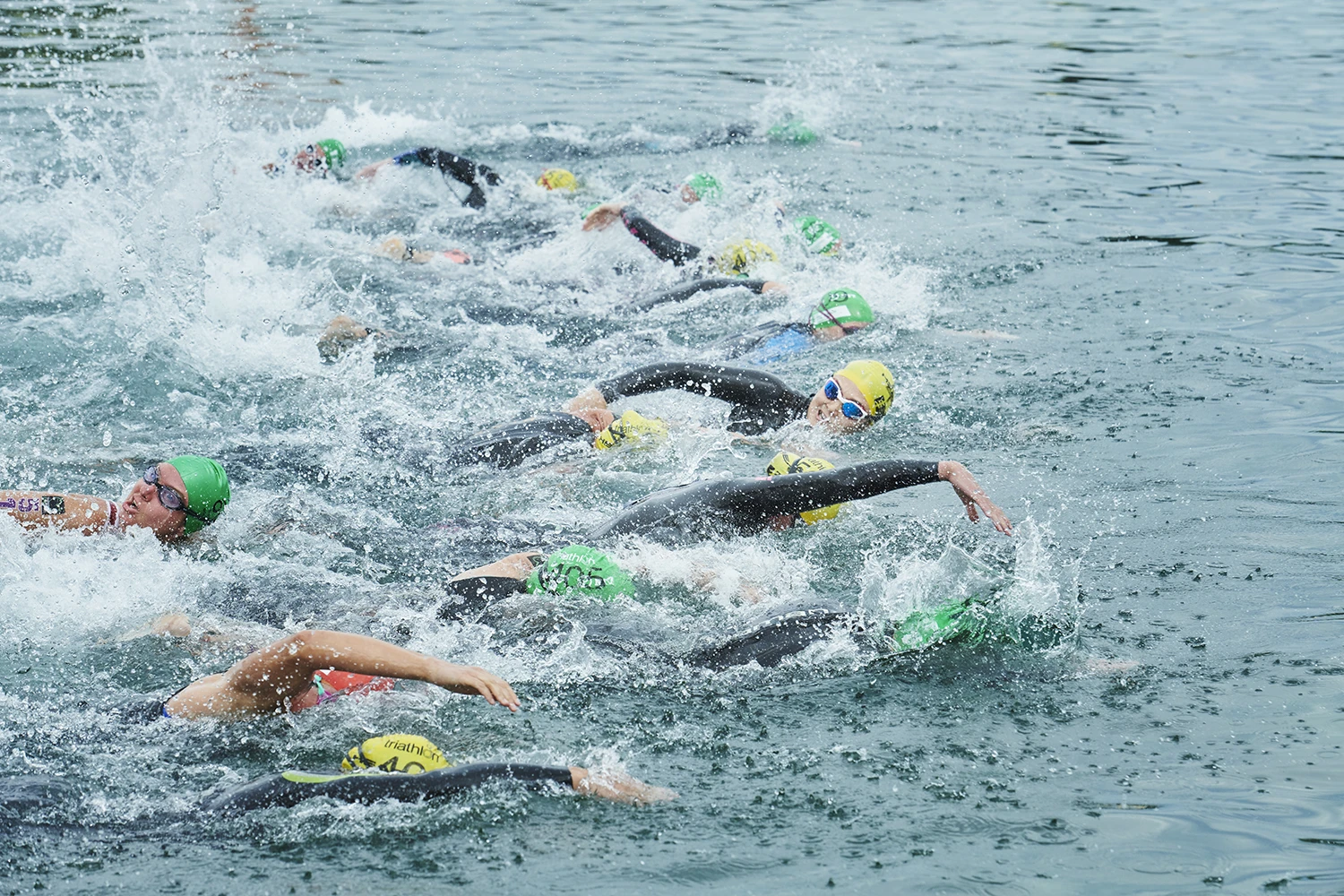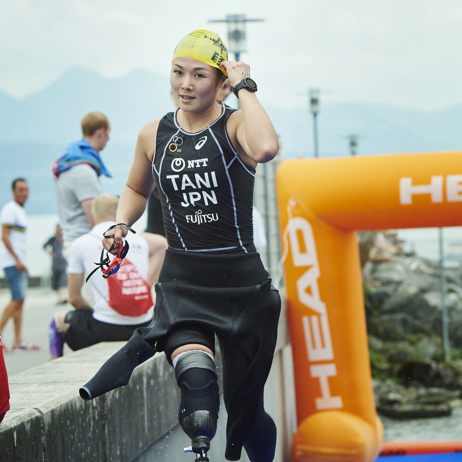 午後2時過ぎ。いよいよスイム(750m)からレースが開始。スイムはトライアスロン3種目の中で谷が最も得意としている種目なだけに、この日もスタートから力強い泳ぎを見せ、12分12秒というPTS4クラス2番手のタイムで最初のトランジションエリアに姿を見せた。