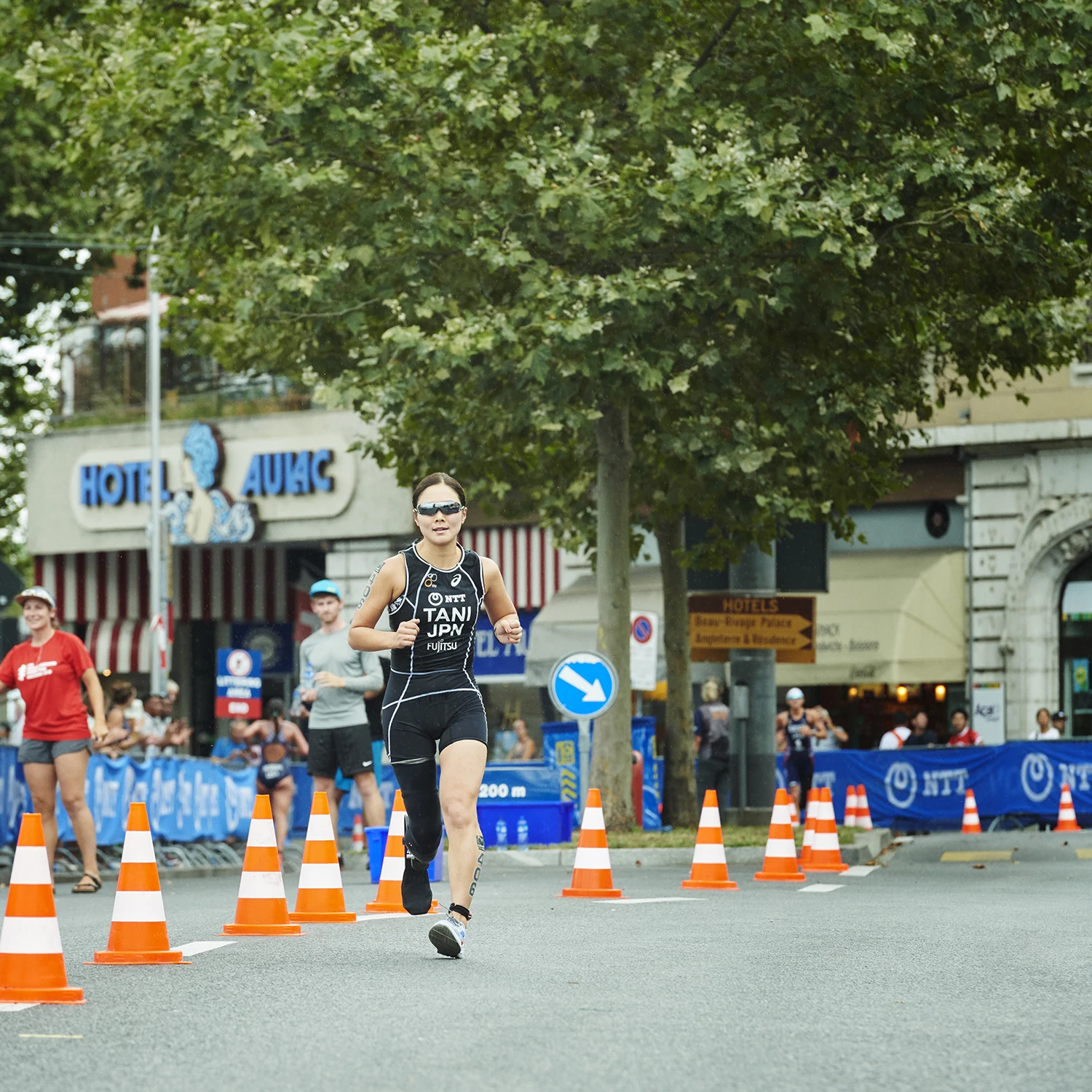 勝負のラン(5km)では、ローザンヌの街並を縫うように設定された美しいコースを力走。気迫のこもった走りでゴールをめざす。