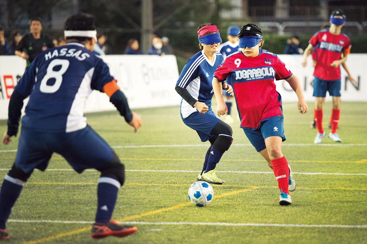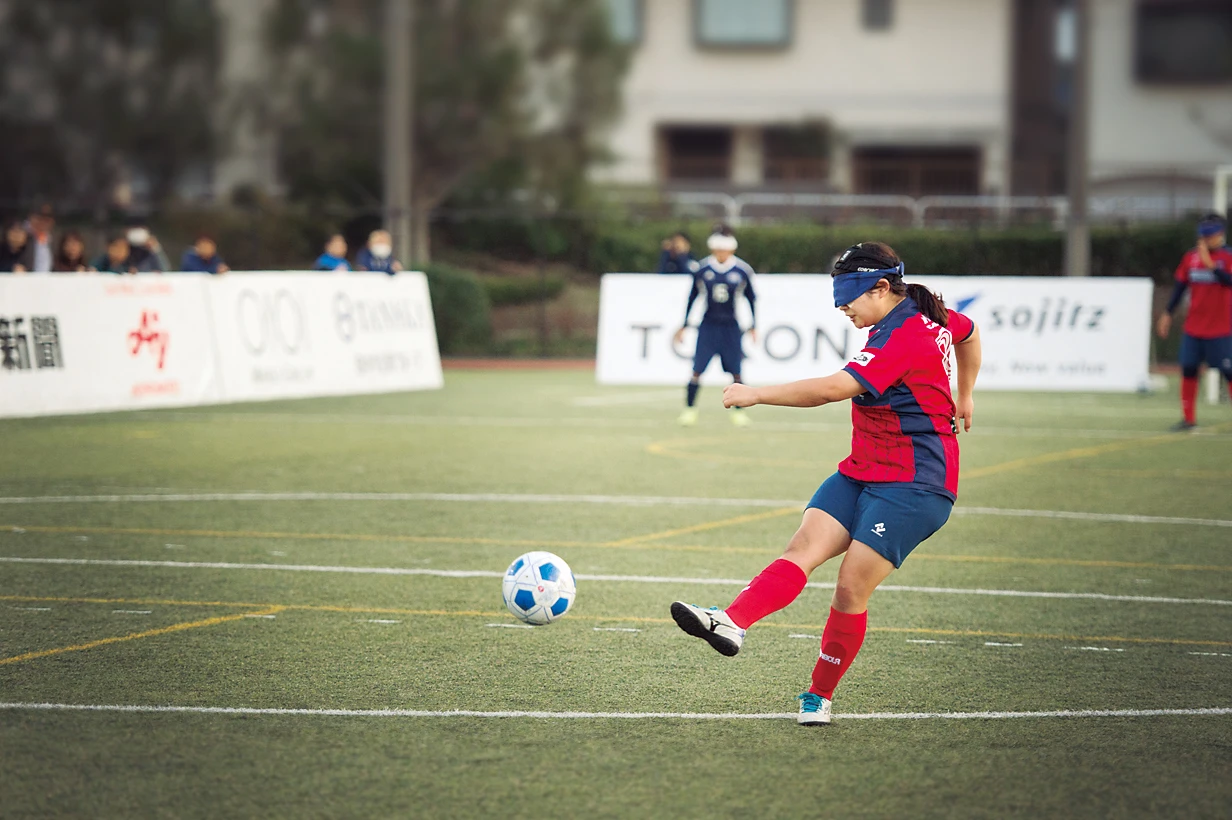 アイマスクをつけてボールの音と声のコミュニケーションで行う。正式名称は5人制サッカー。コートはフットサルと同じ大きさで、ゴールの後ろにいるガイドがゴールまでの距離や角度を教える。ボールを持った相手に向かうときに〝ボイ〟と声を掛けるルールがある。観戦するときは、目隠ししているのに見えているかのようにコートを動き回るところを見て!