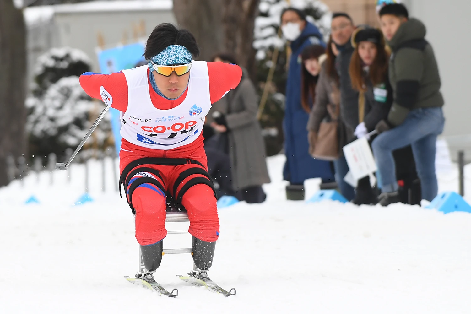 2022年北京冬季パラ出場を目指す強化指定選手の森宏明選手(朝日新聞社)は競技人口の少ないシットスキー(座位)でジュニア選手らと力強く滑走。「自分の競技を披露できる場があるのはモチベーションになる。立位選手とも大差ないスピードが出る(座位)競技を知ってもらえる機会は歴史的なこと」と力を込めた。