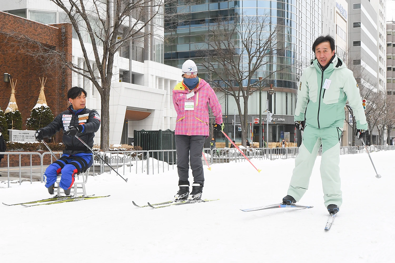 クロカン体験コースにはスキージャンプの金メダリスト原田雅彦さんの姿も。「街中でのレースは外国にはあるが、まさか札幌でできるとは…。車道をシャーっと滑って気分がよかった」と笑顔。オリンピアンとパラリンピアンが一緒に市民と交流するイベントに、「『心一つ』で2030年に向かっています」と話し、ファンとの写真撮影にも気軽に応じていた。