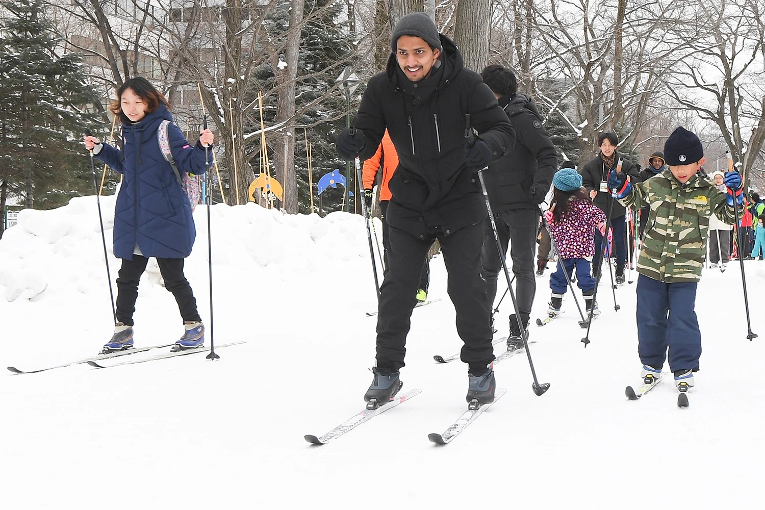 用具も無料レンタルされ、市民や観光客らが気軽に挑戦できた。スケートやアルペン経験があるという50代の女性は、「クロカンは初めて。ずっとやってみたかった。転んでばかりで、選手のすごさが分かった」と声を弾ませ、バングラデシュからの留学生は人生初のスキー体験に、「たくさん転んだが、それも楽しい」と異文化体験を楽しんでいた。
