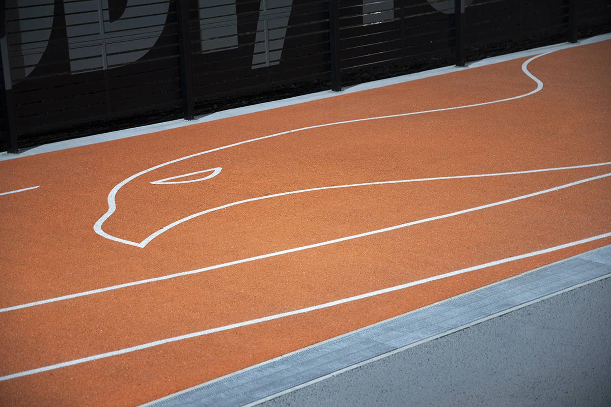 パークを囲む280mの“コルテッツ トラック”には、スニーカーのソールなどにも使用されているリサイクル素材、ナイキ グラインドを使用。弾力性を備えたトラックに仕上がっている。このパークはサステナブルの視点から、各所にリサイクル素材を採用するほか、自動販売機は置かず、ウォーターサーバーを設置してマイボトルの持参を呼びかける。