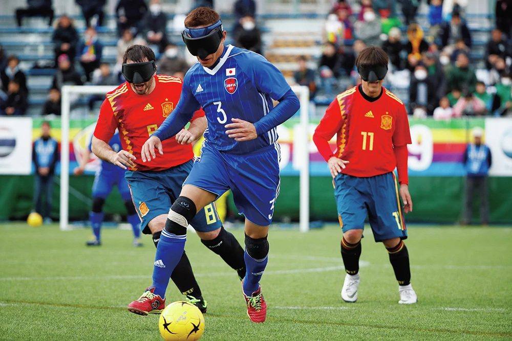 まずはフットサルベースで考案された5人制の「ブラインドサッカー」。GK以外のプレーヤーたちは全員アイマスクを装着し、視覚をシャットアウトして音の鳴るボールやガイドの声を聞きながらプレーするのだが、代表クラスの選手ともなるとそのスピードや正確無比なボールタッチに驚かされるばかり。まさに超人的だ。