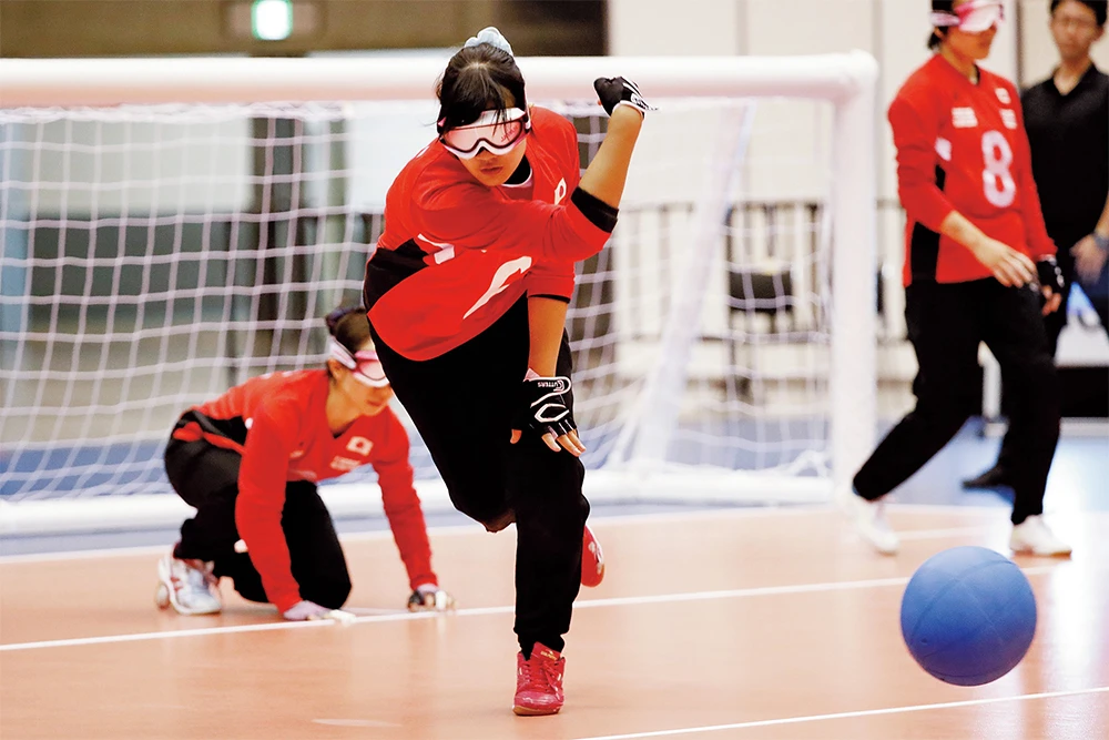 ゴールボールの歴史は古く、第二次世界大戦後に視覚に障がいを負った兵士たちのリハビリプログラムとして考案された3対3のコート競技だ。選手たちはアイシェードという光が完全に遮断されるゴーグルで目隠しをし、鈴の入ったボールをサッカーゴールのような相手ゴールに向けて投球し、ディフェンスは全身を使ってセービングする。コートはバレーボールと同じサイズ。