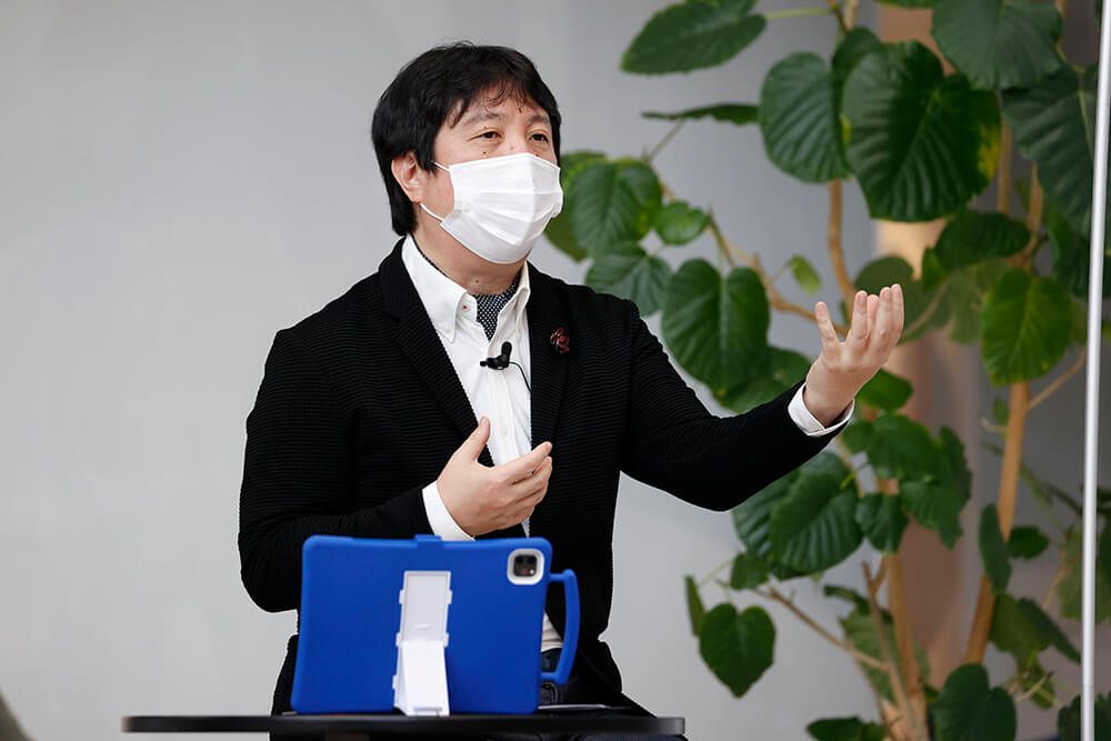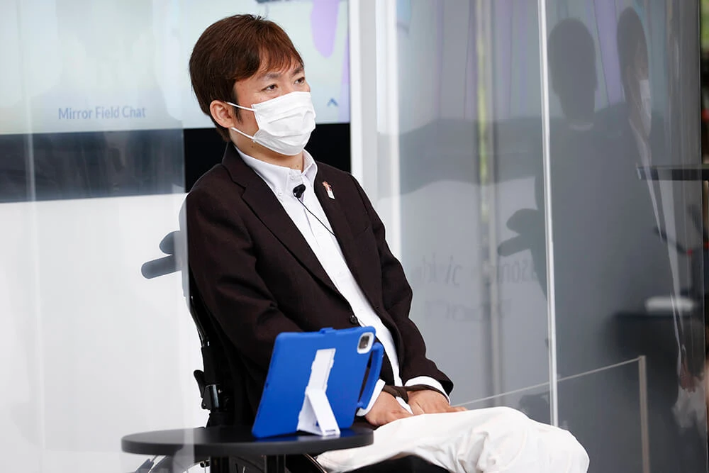 「18歳でバイク事故にあって頸髄を損傷し、車いす生活となりましたが、1995年にインターネットに出会って人生が変わりました。バリアなく世界とつながれるということに大きな衝撃を受けて、1→10(ワントゥーテン)という会社を設立しました。東日本大震災、コロナ禍と大きなできごとがあるたびにテクロジーが急速に広まっていきます。今やっと、世界中が協力して物理的バリアを超えていく段階になってきたと実感しています。Mirror Fieldはオンラインでも、アバターの反応で盛り上がりが可視化できるところに可能性を感じました」(澤邊さん)